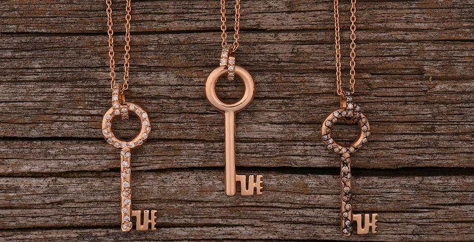 La clau, d’una gran bellesa, ha servit ara d’inspiració per crear diferents models d’anells i penjolls de mides diverses realitzats en plata, or rosa, diamants blancs i diamants marrons.