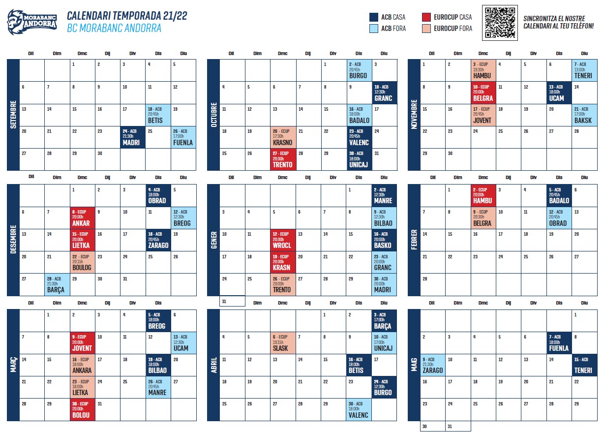 La Lliga Endesa arrencarà pel Bc MoraBanc Andorra el dia 18 de setembre a la pista del Coosur Real Betis segons el calendari fet públic per l’ACB. El primer partit a casa es disputarà el divendres 26 de setembre a les 21h30 amb la visita del Real Madrid a la Bombonera. Aquesta temporada un dels plats forts arribarà de seguida. L’equip d’Ibon Navarro visitarà el diumenge 26 a l’Urbas Fuenlabrada completant així les tres primeres jornades de competició. El darrer partit de la primera volta serà a la pista del Bilbao Basket el 9 de gener. Aquest serà el darrer partit abans del tall de la Copa del Rei. En la segona volta destaca la visita del Barça, l’actual campió, el diumenge 3 d’abril. La lliga regular acabarà pels tricolors visitant el 9 de maig el Casademont Saragossa i rebent a casa el 14 de maig el Lenovo Tenerife.